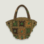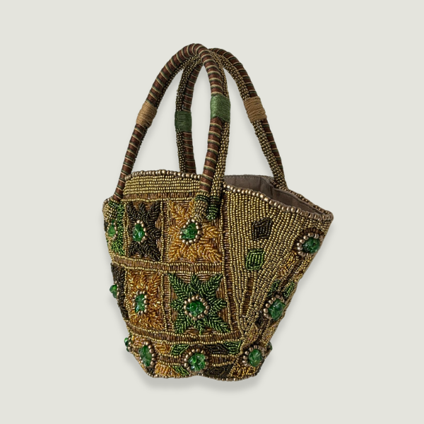 Bordado a mano con cuentas. Interior forrado 100% algodón, bolsillo con cremallera y cierre de correa de piel con imán.