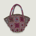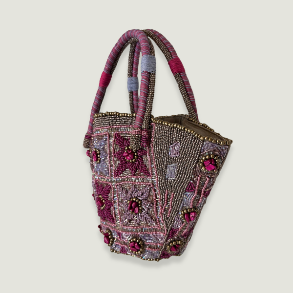 Bordado a mano con cuentas. Interior forrado 100% algodón, bolsillo con cremallera y cierre de correa de piel con imán.