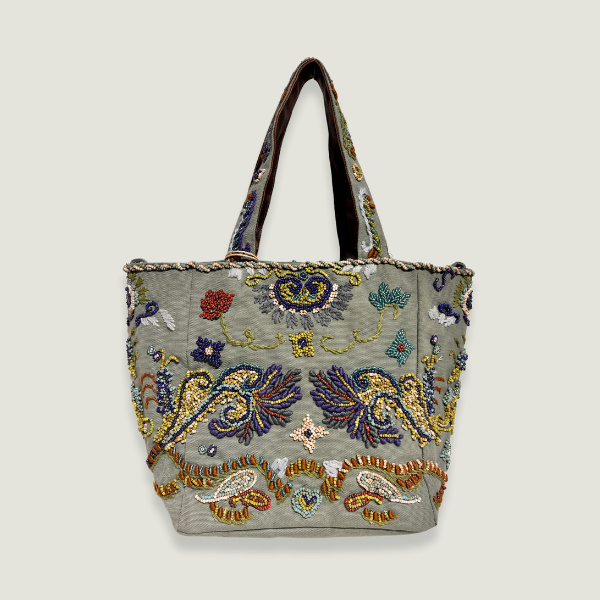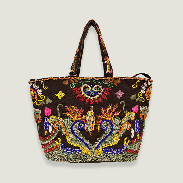 Bordado a mano con cuentas. Forro interior 100% algodón, bolsillo para móvil. Cierre con un bonito nudo de algodón.