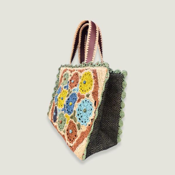 Casual handbag made in raffia macrame and jute.